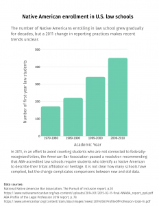 Unreliable data make it difficult to measure Native American representation in the legal field, as many people who are not enrolled members of tribes check the Native American box on forms. The gap is large: On the 2010 U.S. Census, 5.2 million people selected American Indian or Alaska Native as one of their races, but in the same year, just under 2 million were enrolled as members of federally-recognized tribes. Law schools are not required to ask applicants who identify as Native American to describe their ancestry or tribal affiliation, though the American Bar Association has recommended that they do so.