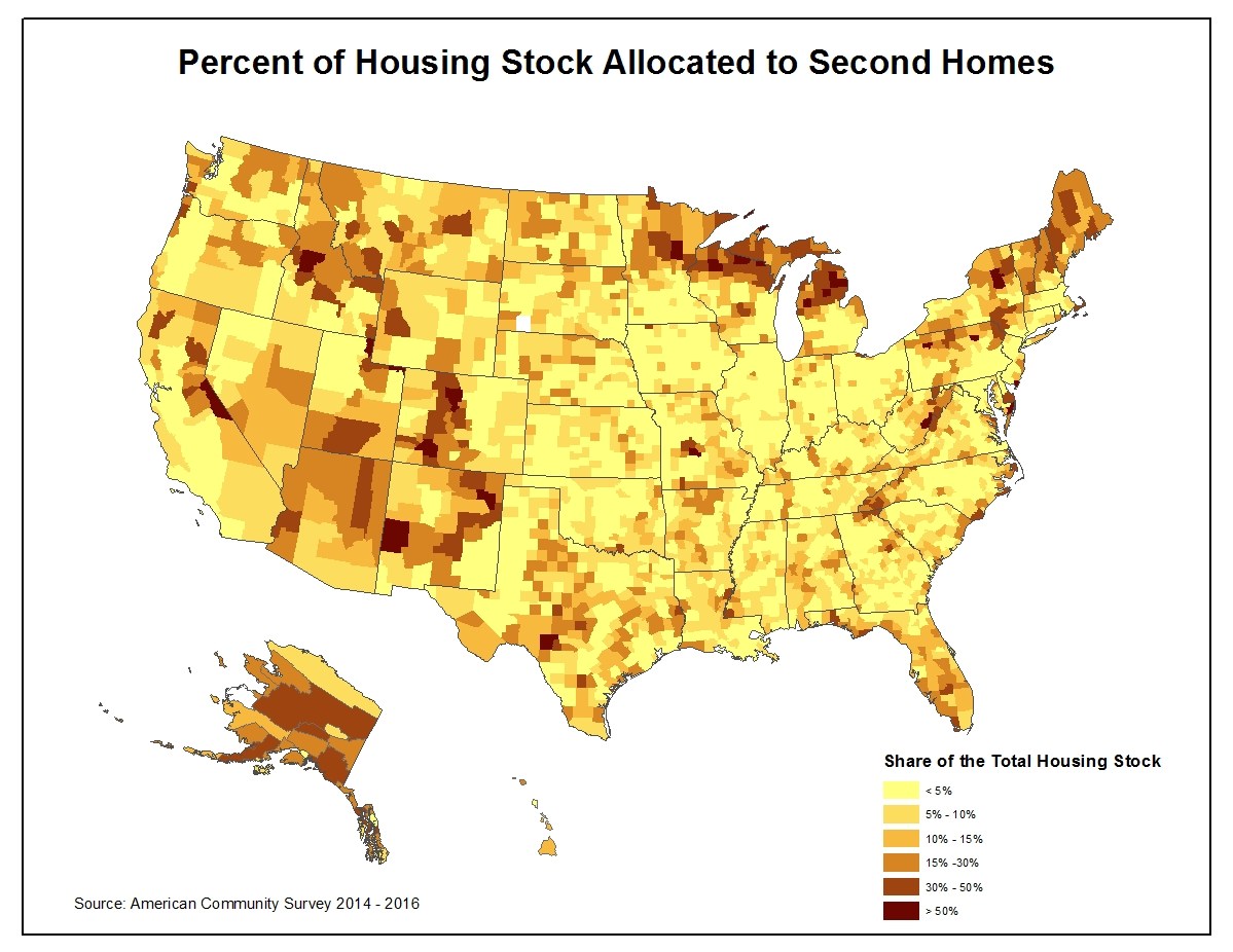 This map indicates the density of housing in areas with the United States. Below, on the bottom right, is a key that depicts the percentage of homes that are considered second homes. The image depicts the northern region of Wisconsin in a dark red which indicates that 50 percent of homes in those areas are second homes.)